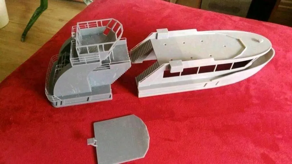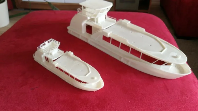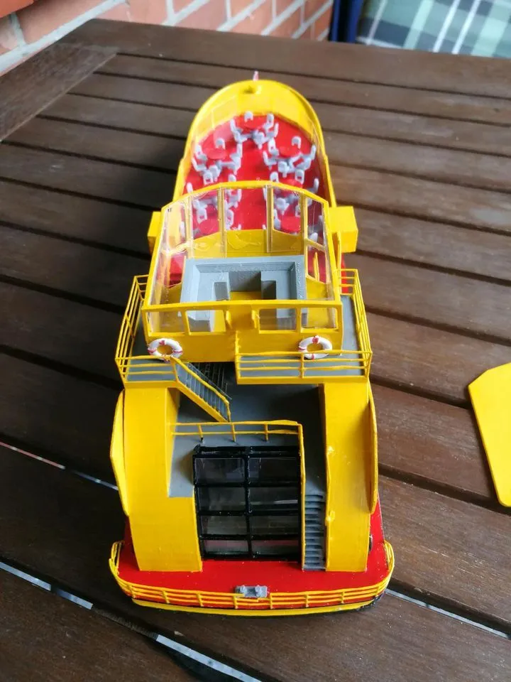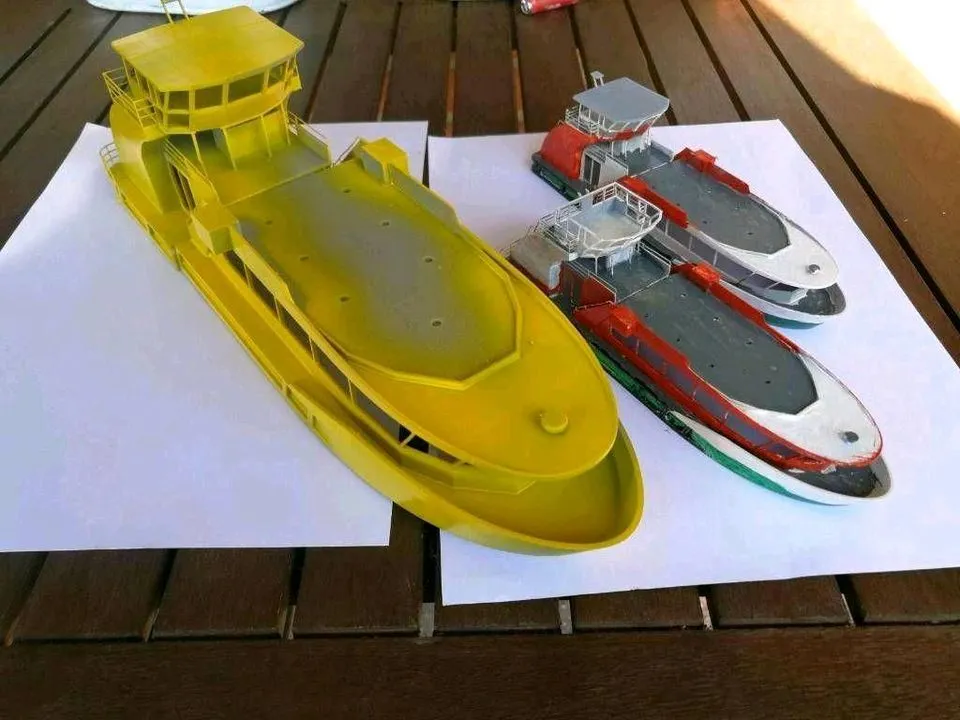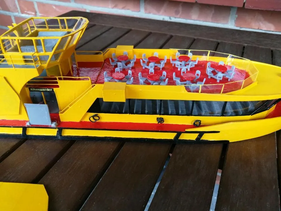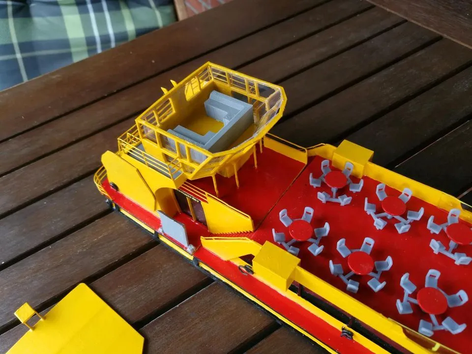 Mit dem 3D-Drucker hergestellt, von handbemalt und beschriftet. Die Modelle gibt es in verschiedene Varianten, unter Deck ist ein Boden mit Sitzen eingebaut.Verschiedene Baureihen als Wasserlinienmodell, Lieferzeit je nach Aufwand ca. 4 Wochen