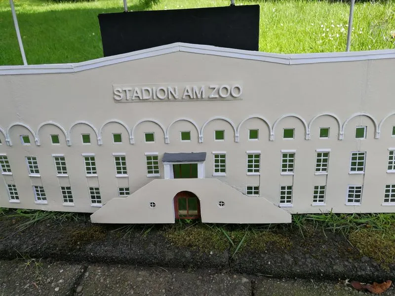 Stadion am Zoo in Wuppertal als Fassade gebaut in HO (Länge 1260 mm und 250 mm hoch) für eine Modellbahnanlage im Vordergrund die Schwebebahn.