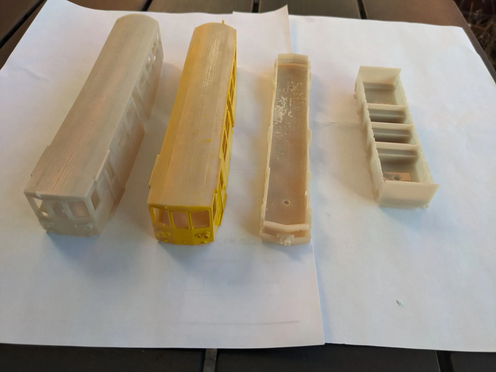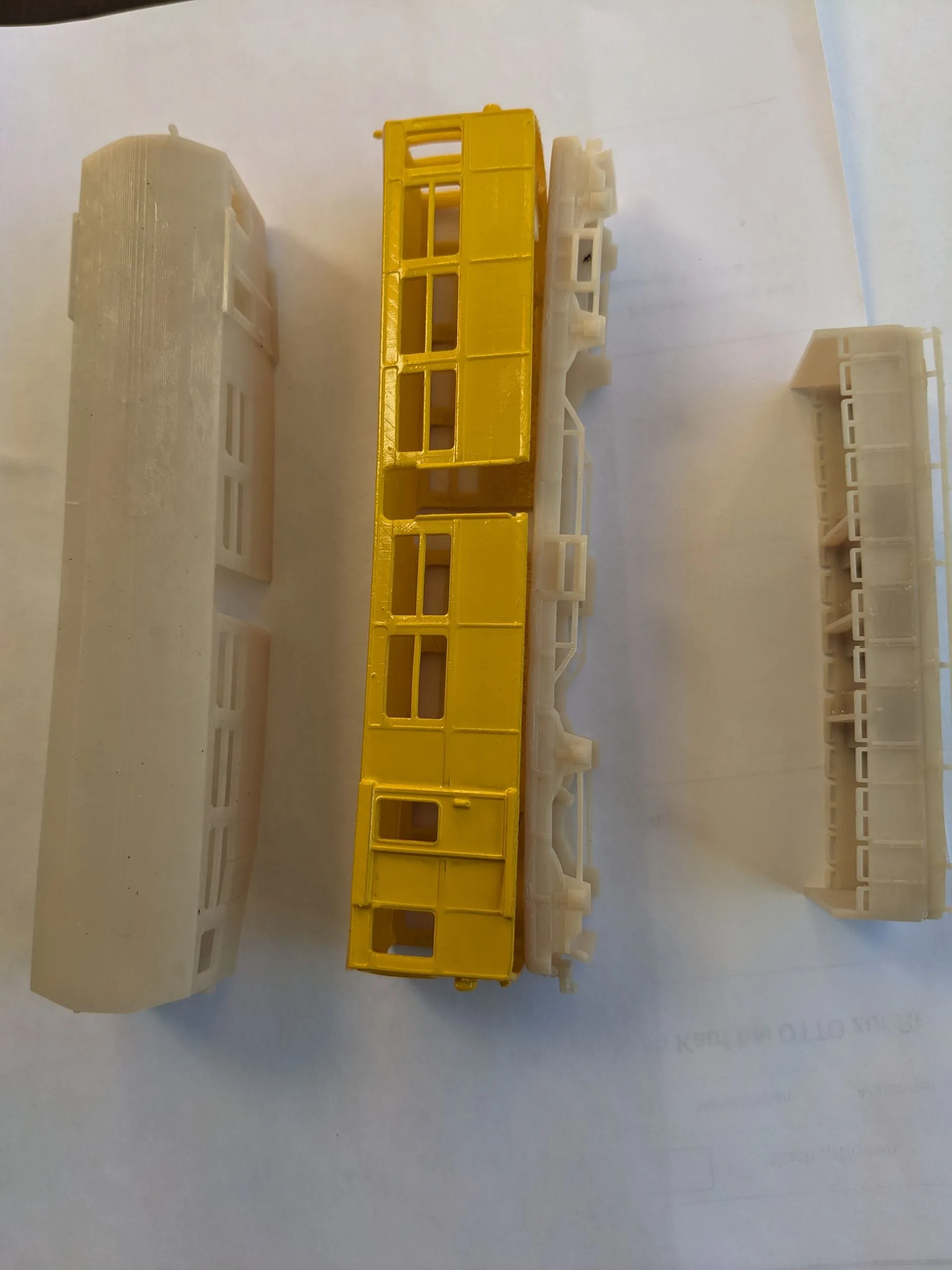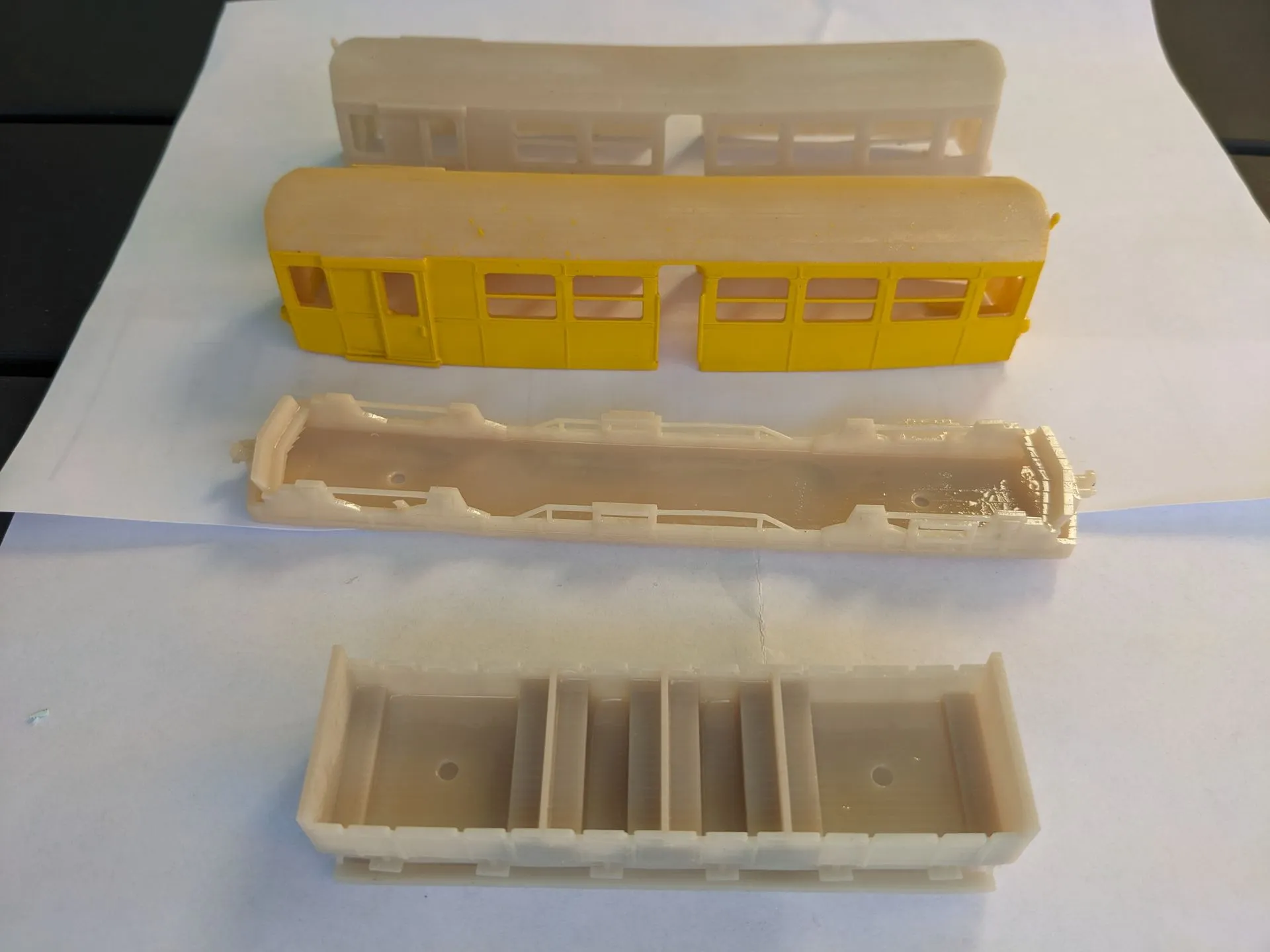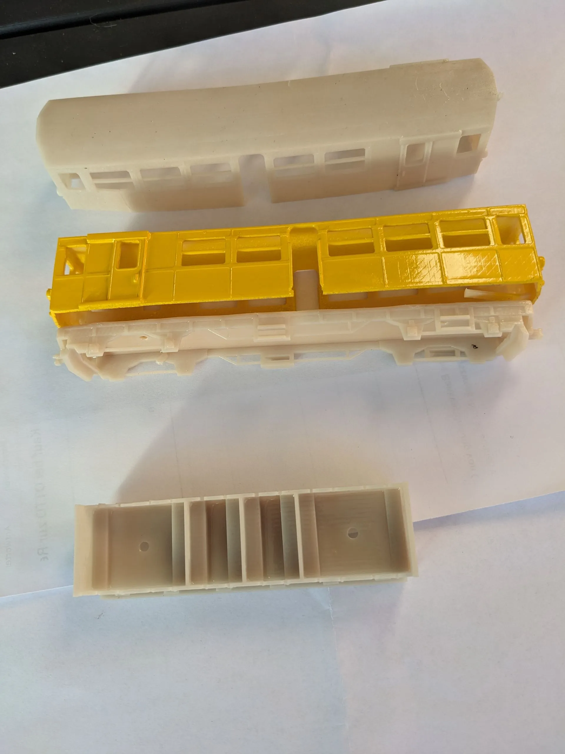 Der Gelbe Zug mit Bodenplatte in N/TT für 53.-€uro, entweder mit oder ohne Drehgestelle, die Inneneinrichtung ist in Arbeit. Die Gehäuse werden aus Resin mit einem 3 D Drucker gefertigt und gereinigt.